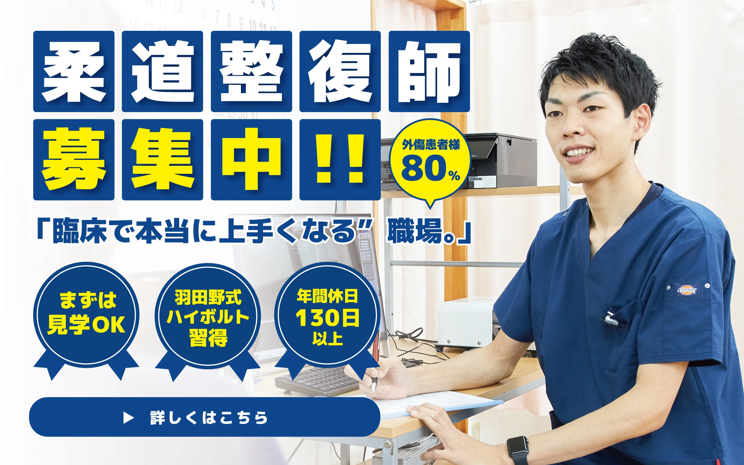 具体的には、柔道整復師という国家資格を取得した専門家が骨折・脱臼・打撲・捻挫・挫傷というケガに対して保存的治療(手術を行わない治療)をケガの種類や程度を見分け、そのケガに合った適切な施術をします。